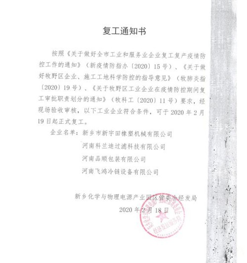今年的2月中詢,新鄉(xiāng)市牧野區(qū)、工業(yè)園區(qū)等領(lǐng)導(dǎo)數(shù)次來我司檢查了關(guān)于疫情的防護工作,通過檢查為我司提出了復(fù)工方面的指導(dǎo)和寶貴建議,我司虛心接受并做了相應(yīng)的調(diào)整,現(xiàn)依據(jù)市政府的相關(guān)疫情部署相關(guān)文件,科蘭迪過濾公司決定聯(lián)系相關(guān)一部分人員復(fù)工生產(chǎn),望所有上崗的員工忠于職守,在家的員工做好疫情自我防護工作。