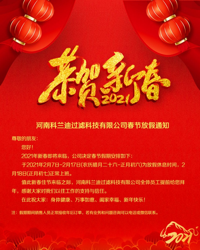 2021年河南科蘭迪過濾春節(jié)放假通知