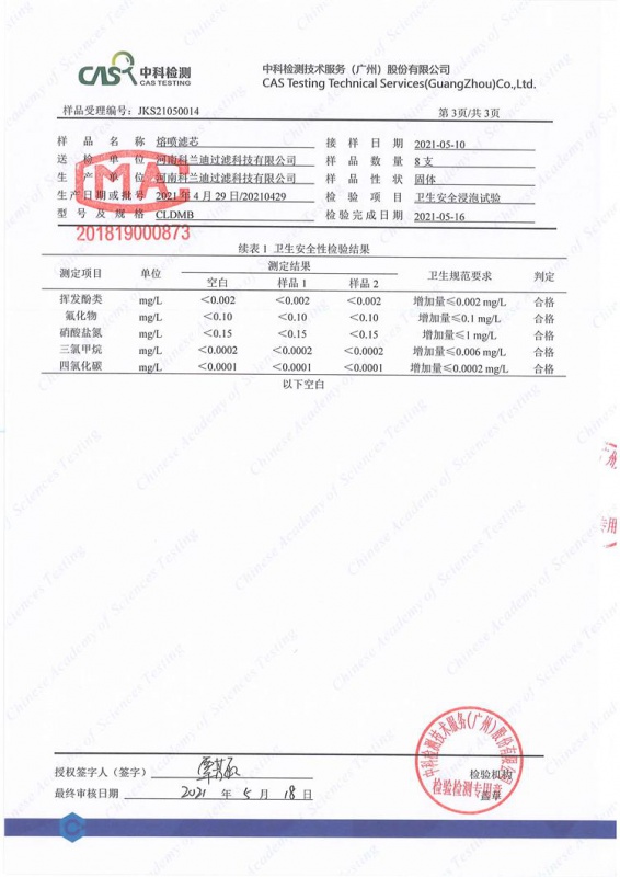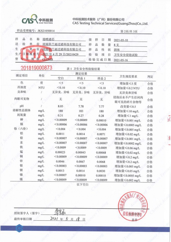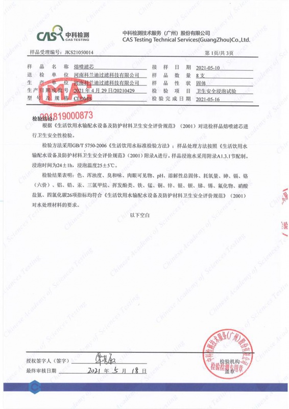 河南科蘭迪過濾生產(chǎn)的PP熔噴濾芯經(jīng)過具有CMA認(rèn)證的第三方實(shí)驗(yàn)室“中科檢測公司”檢測符合《生活飲用水輸配水設(shè)備及防護(hù)材料衛(wèi)生安全評價(jià)規(guī)范》(2001)中對水處理材料的要求。